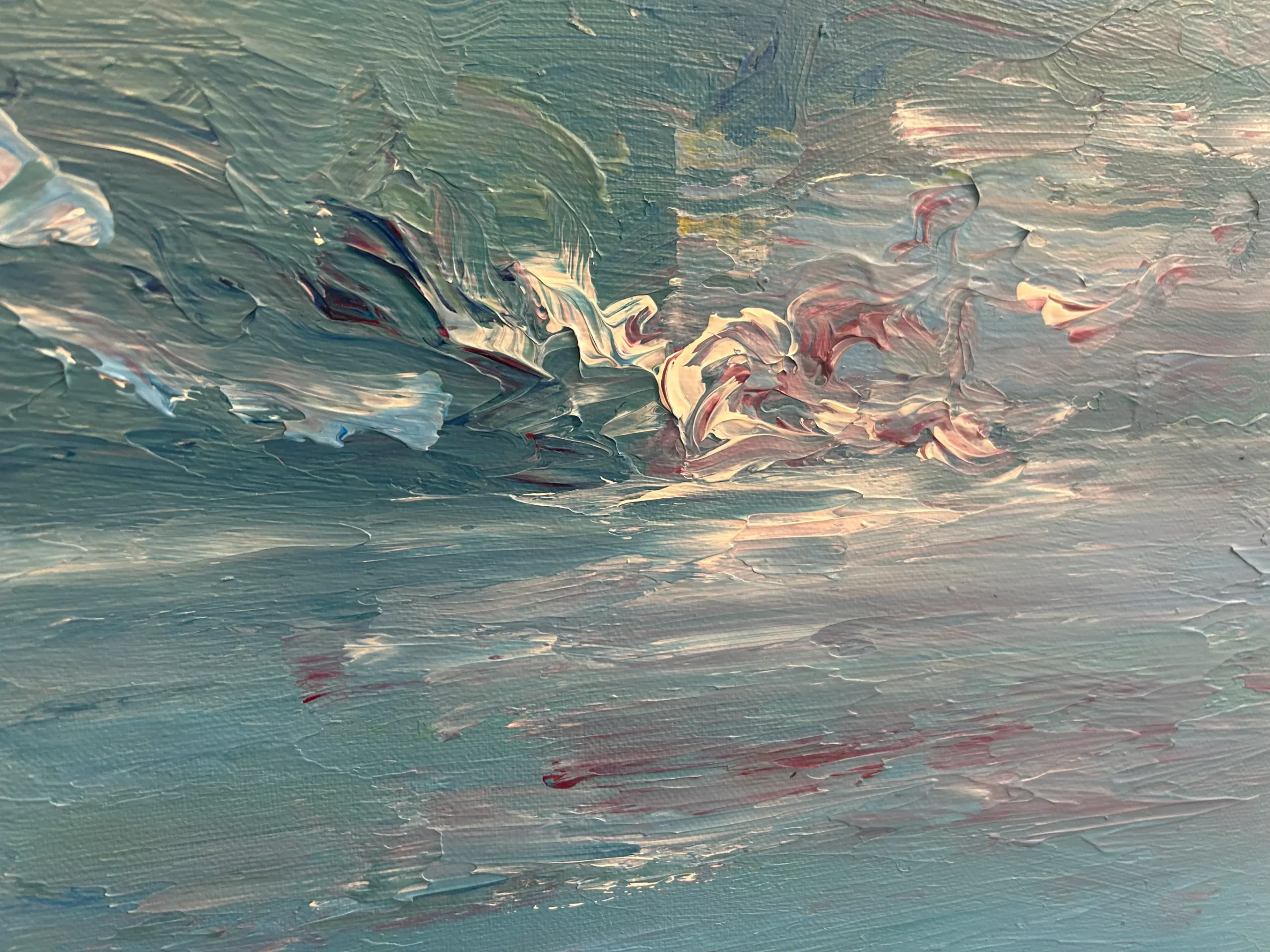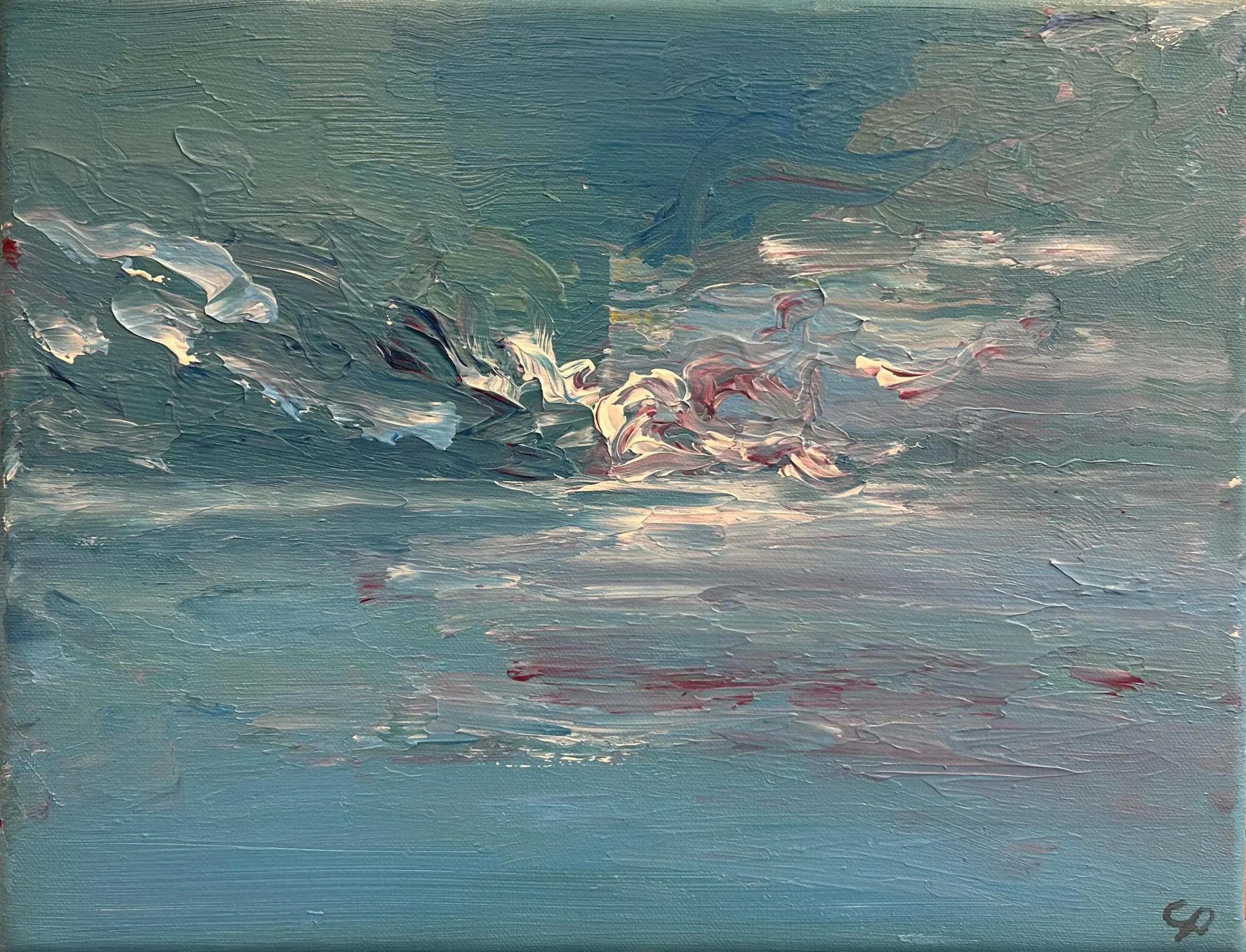 La collection « Éclaircie » arrive après la tempête. Certaines œuvres illustrent l’apaisement, le retour au calme. D’autres expriment l’état totalement opposé à la tempête : une immersion dans le bonheur et les émotions joyeuses. Cet état se manifeste à travers des toiles aux couleurs vives, réalisées sans pinceaux, directement aux doigts, pour transmettre les émotions du corps vers la toile.